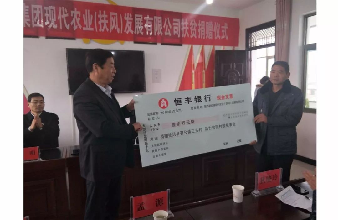 12月7日,红锋集团旗下现代农业公司为扶风县召公镇三头村捐资十万元,助力村委会基础设施和环境建设,推进贫困村脱贫工作进程。